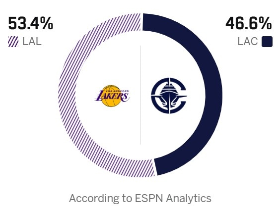今天,ESPN预测本场比赛胜率,湖人53.4%,快船46.6%。